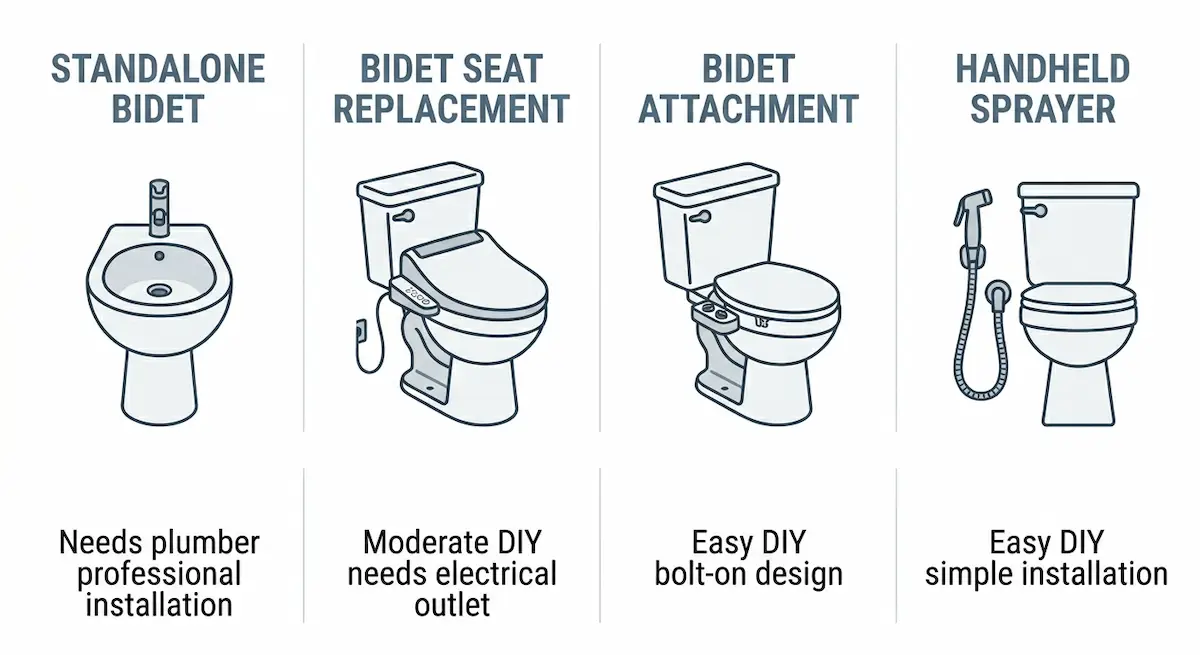 It depends on the type. Bidet attachments, handheld sprayers, and non-electric seat replacements are generally DIY-friendly installs that connect to your existing supply line. Standalone bidets require a plumber for the drain and supply work. Electric bidet seats may require an electrician if there’s no GFCI outlet near your toilet.